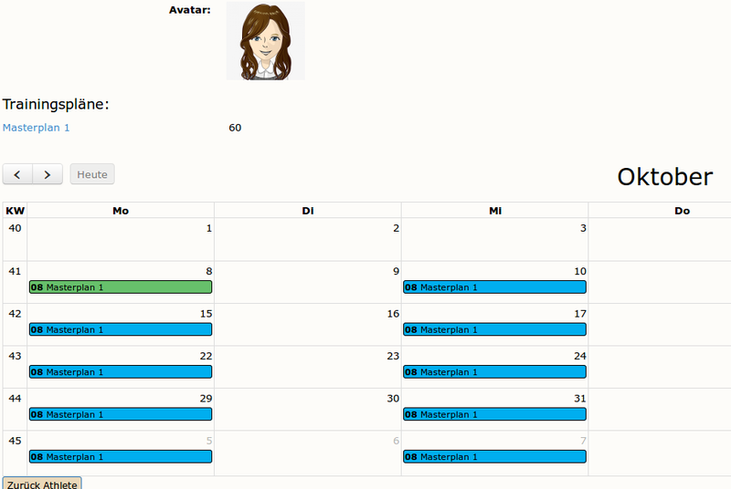Blau sind Termine, die noch nicht durchgeführt wurden, grün werden Termine dargestellt, die bereits zu 100% vom Athleten durchgeführt wurden.