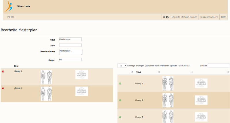 Links werden die Übungen dieses Masterplans angezeigt.