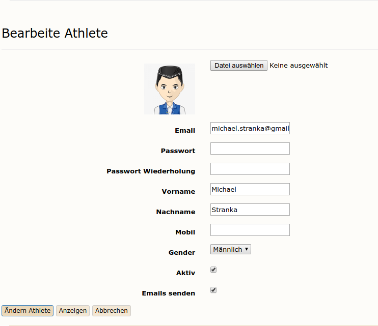 Email: mit der email meldet sich der Athlete an. Auch werden Nachrichten eventuell auch an diese Email-Adresse gesendet (siehe "Emails senden")