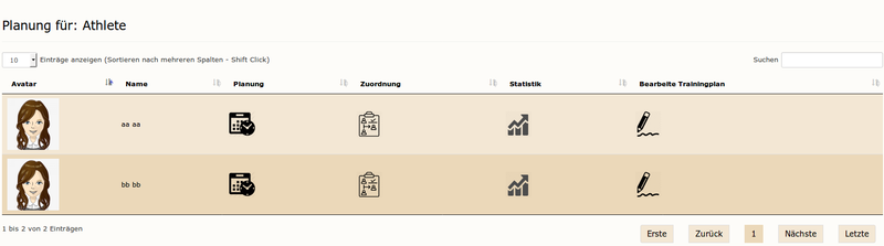 Trainingspläne: hier werden alle diesem Athleten zugeordneten Trainingspläne aufgelistet. Ein Klick auf den Titel eines Planes öffnet diesen.